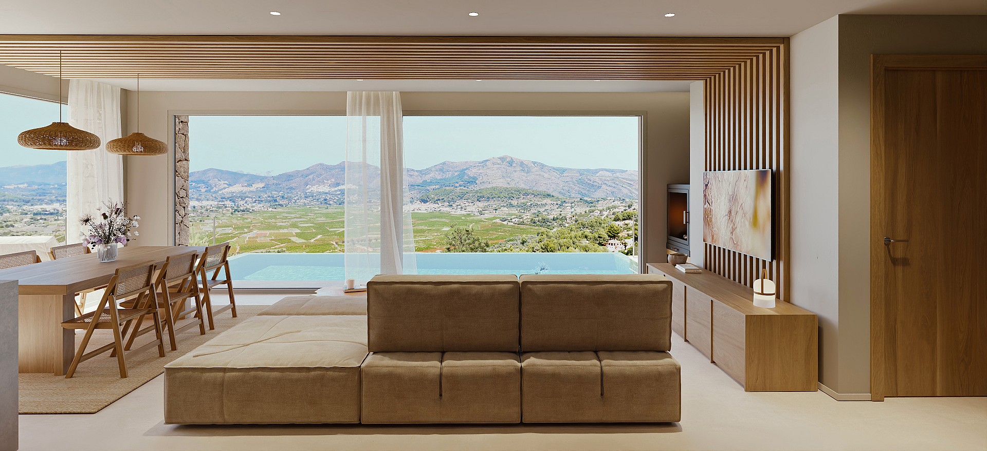 Designed to blend into the surroundings, the house adapts to the sloping terrain, creating outdoor plateaus that extend life towards the Vall de Pop. Dry-stone walls, wooden pergolas, and green roofs engage in a dialogue with nature. The infinity pool and xeriscape gardens make the horizon a part of the daily experience.